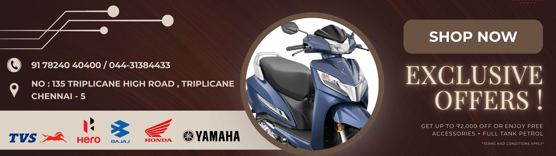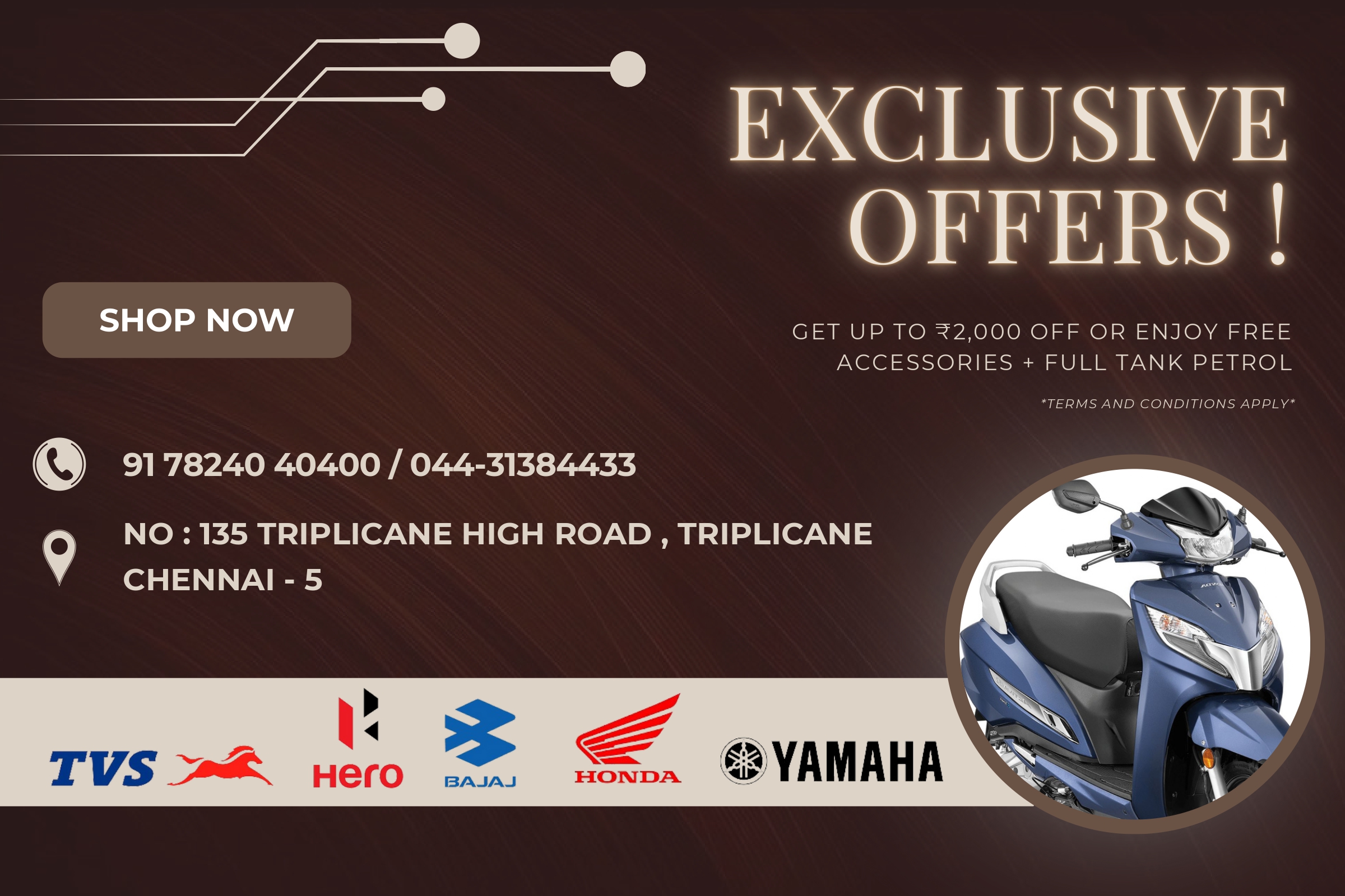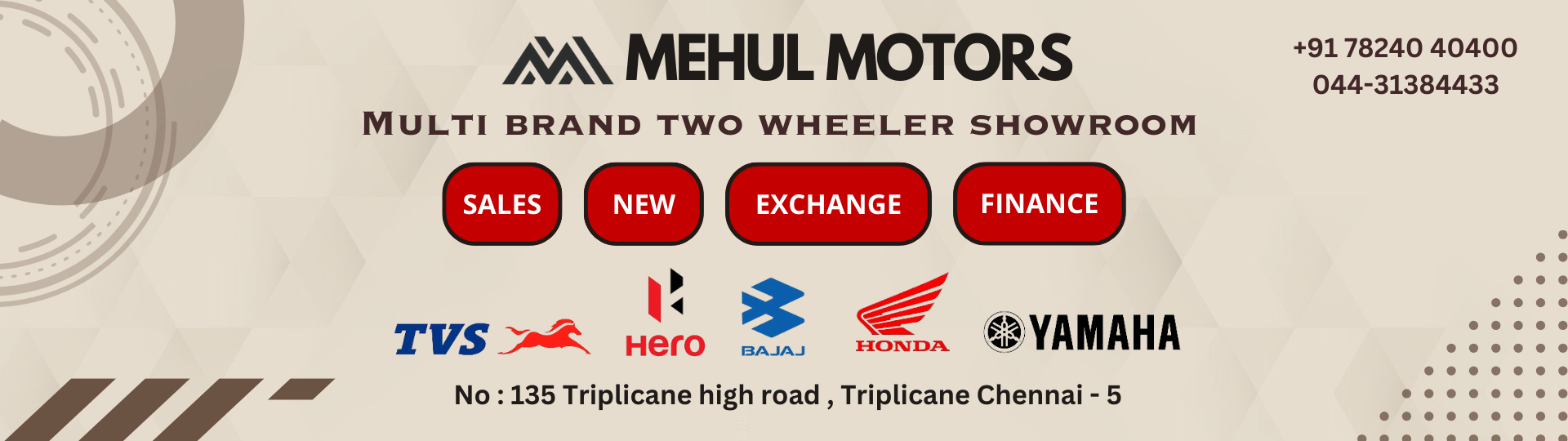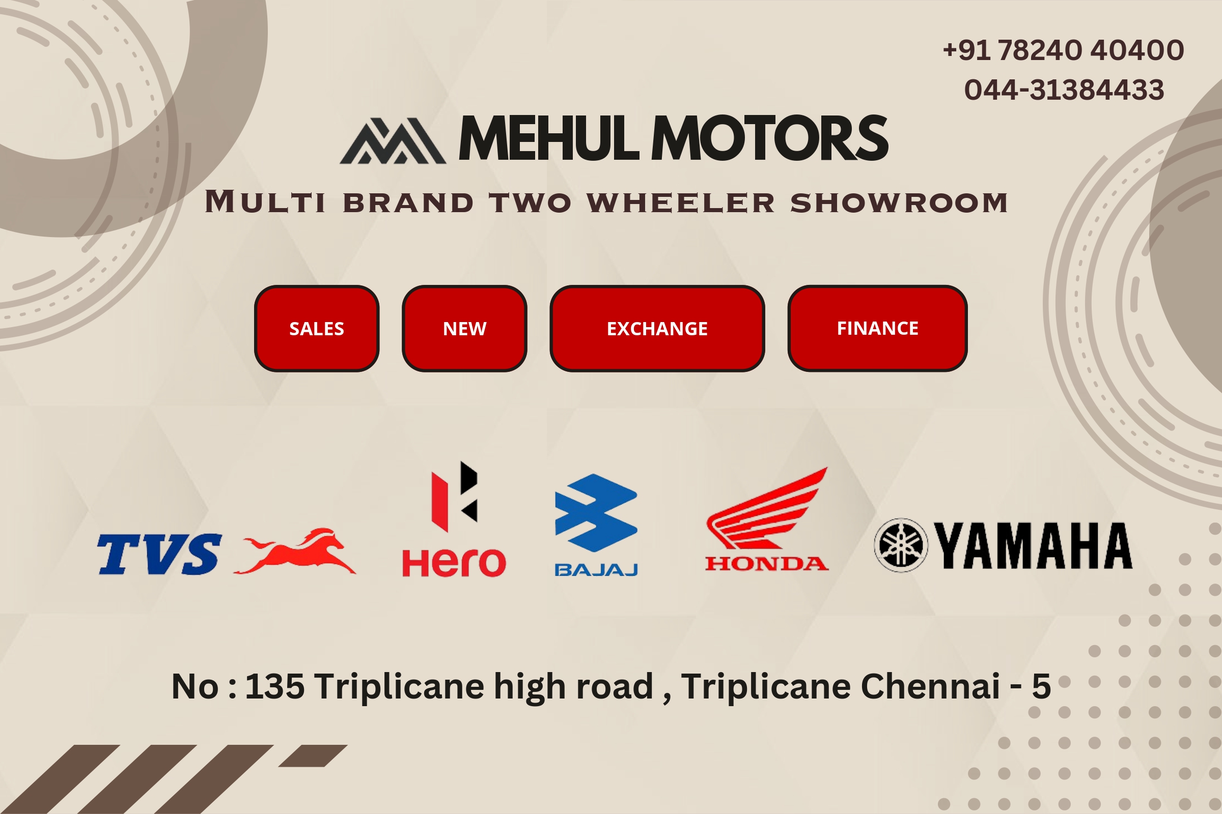 Welcome to Mehul Motors, the premier two-wheeler showroom located on Triplicane High Road, Chennai. We specialize in providing the best deals in two-wheelers, offering a vast selection of motorcycles and scooters to fit every rider’s needs. Our knowledgeable team is dedicated to assisting you in finding the perfect two-wheeler that suits your lifestyle and budget.